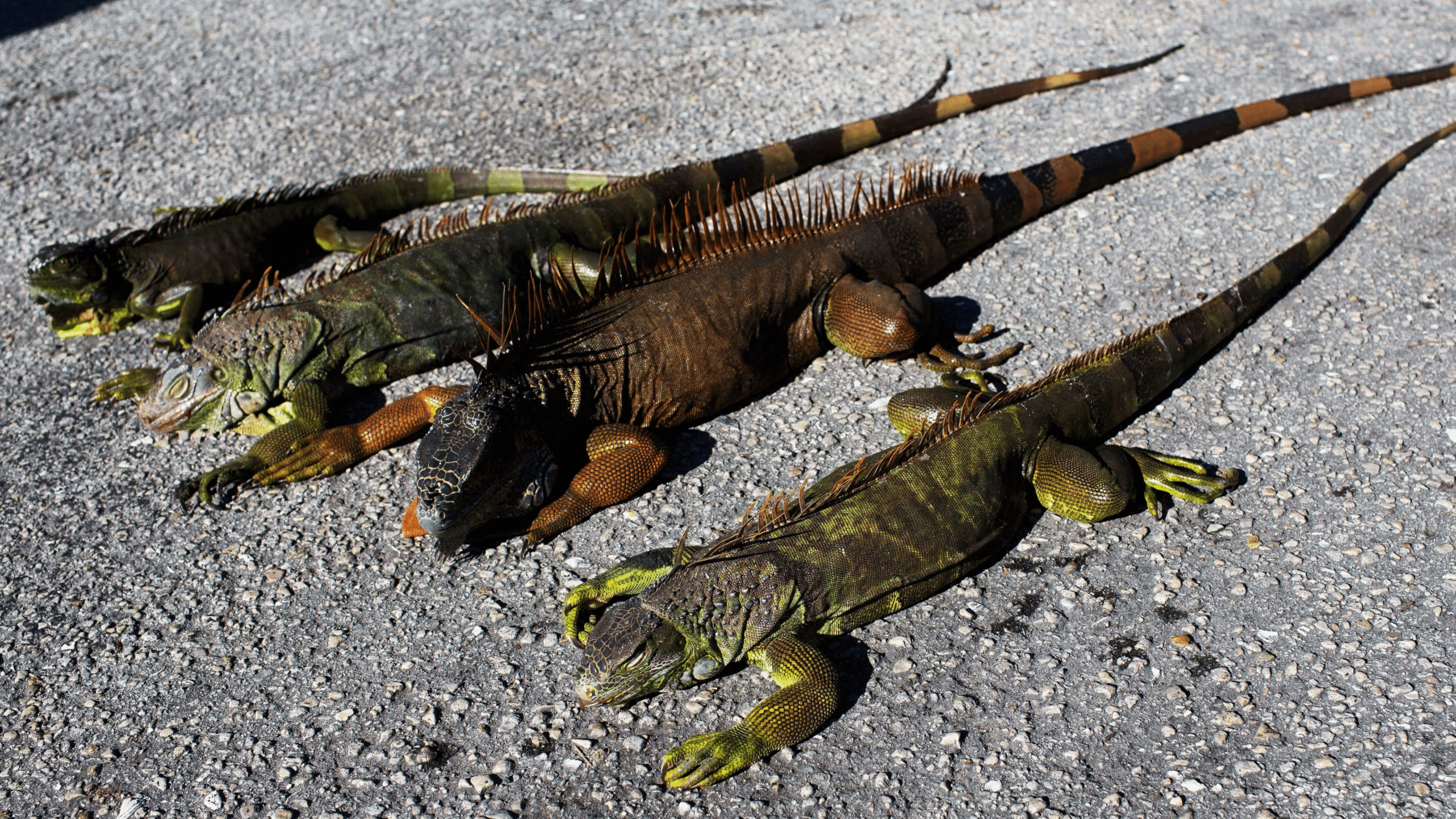 Florida is so cold the iguanas are falling out of trees. Iguanas are cold-blooded. They slow down or become immobile when temperatures drop into the 40s (4-9 Celsius). They may fall from trees, but they are not dead.