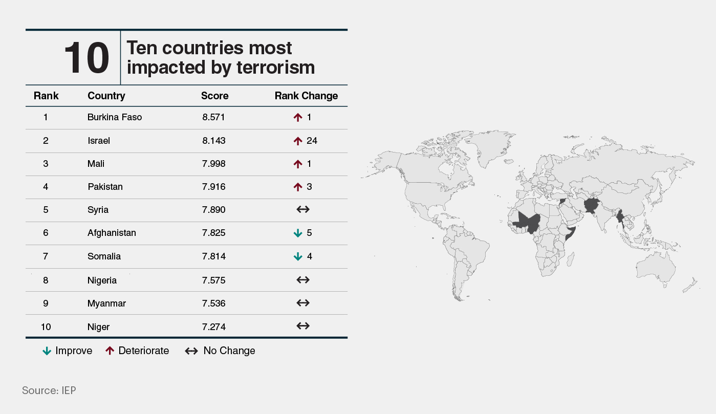 Israel had the largest increase in terrorism deaths, increasing from 24 to 1,210 deaths. Israel rose 24 ranks on the GTI from 2022-2023 to 2nd, the largest change in rank out of the countries in the top ten. The attack in Israel by Hamas was the single largest terrorist attack since the inception of the GTI, the biggest since 9/11 and one of the largest terrorist attacks in history.