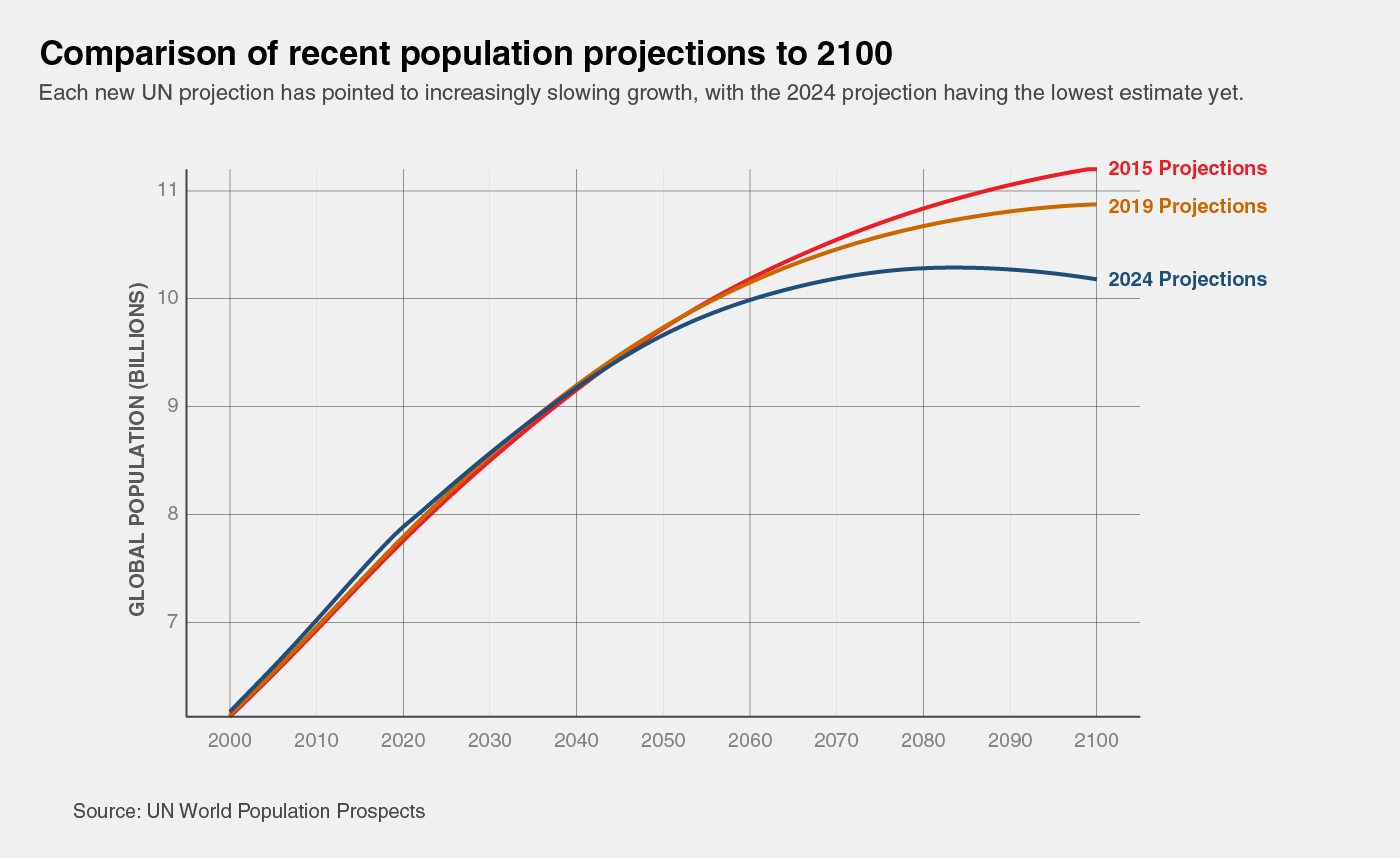 Population projections have been revised downward over the past decade, driven largely by faster-than-expected declines in fertility rates, particularly amongst many African, Asian, and Pacific countries.