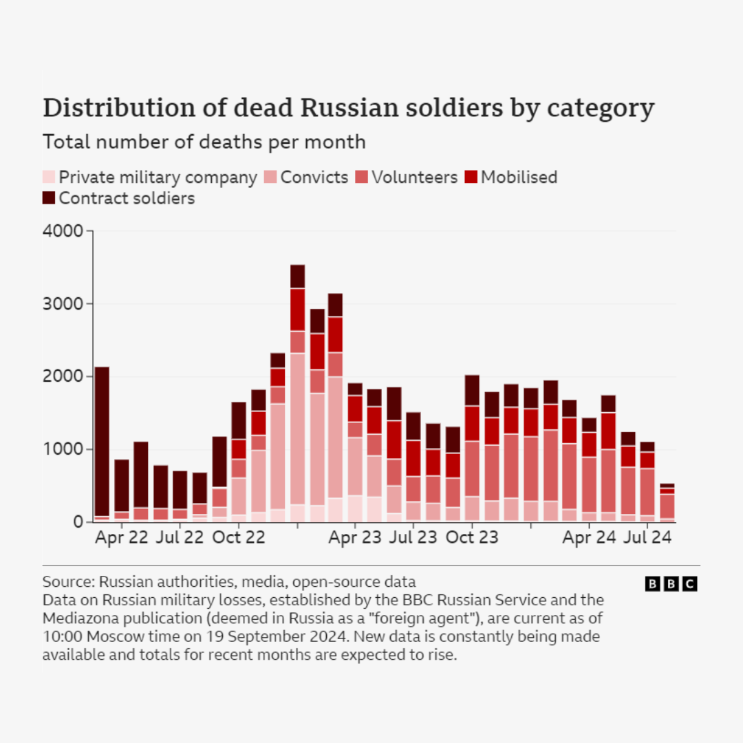 Data from Russian sources, media, and open-source information illustrate that Russian casualties are drawn from several distinct groups. These include private military companies, convicts, volunteers, mobilized citizens, and contract soldiers. Over time, we’ve seen fluctuations in death tolls across these categories, particularly among the mobilized and convicts. After a significant surge in casualties in late 2022 and early 2023, deaths began to taper off. Despite these reductions, however, the trend still demonstrates that mobilised soldiers and convicts bear a substantial burden of the death toll. By mid-2024, the deaths of contract soldiers and convicts seem to stabilize, but the death tolls are consistently high across categories.