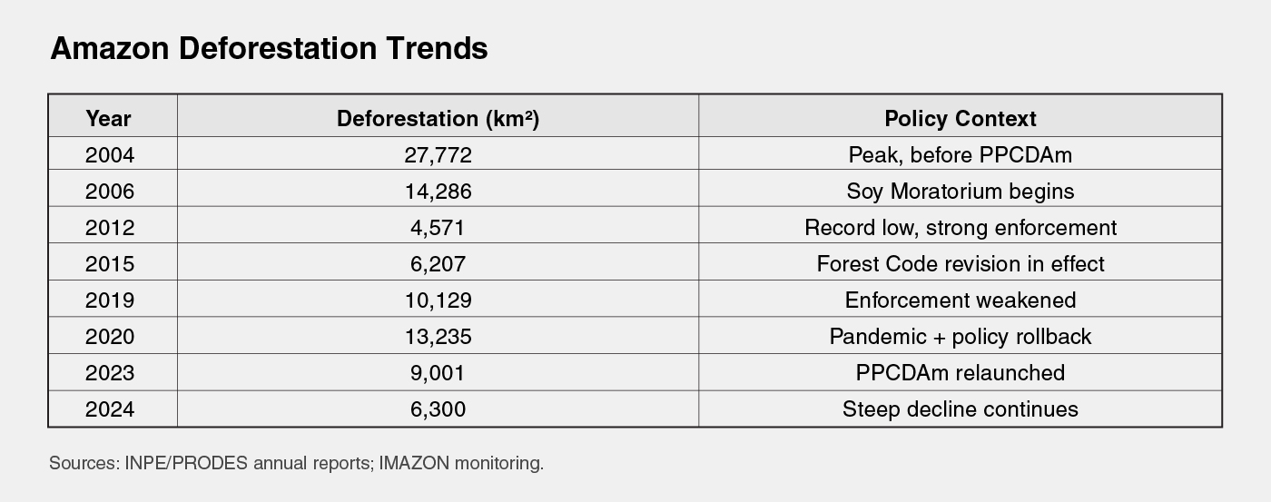 In 2004, Brazil launched the Action Plan for the Prevention and Control of Deforestation in the Amazon (PPCDAm). Coupling satellite monitoring with “blacklists” and credit restrictions, it allowed real-time enforcement. The 2006 Soy Moratorium, brokered with agribusiness, prohibited soy sourcing from newly deforested Amazonian land.