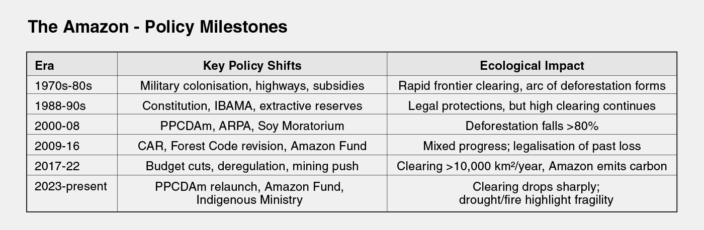 Globally, these decades placed the Amazon on the environmental map as deforestation became a focus for international conservation movements. Yet domestically the forest was cast as an obstacle to development, and policies overwhelmingly favoured exploitation.