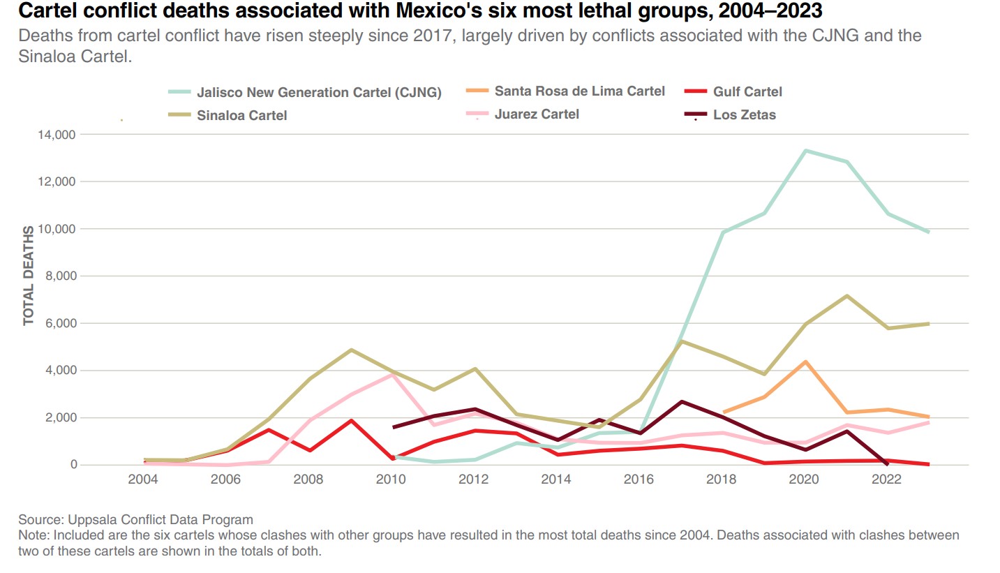 According to data from the Uppsala Conflict Data Program (UCDP), the CJNG has been associated with three out of four homicides from cartel clashes since 2016. The breakdown of an alliance between the CJNG and the Sinaloa Cartel in 2017 marked the beginning of a steep rise in cartel conflict deaths nationwide.