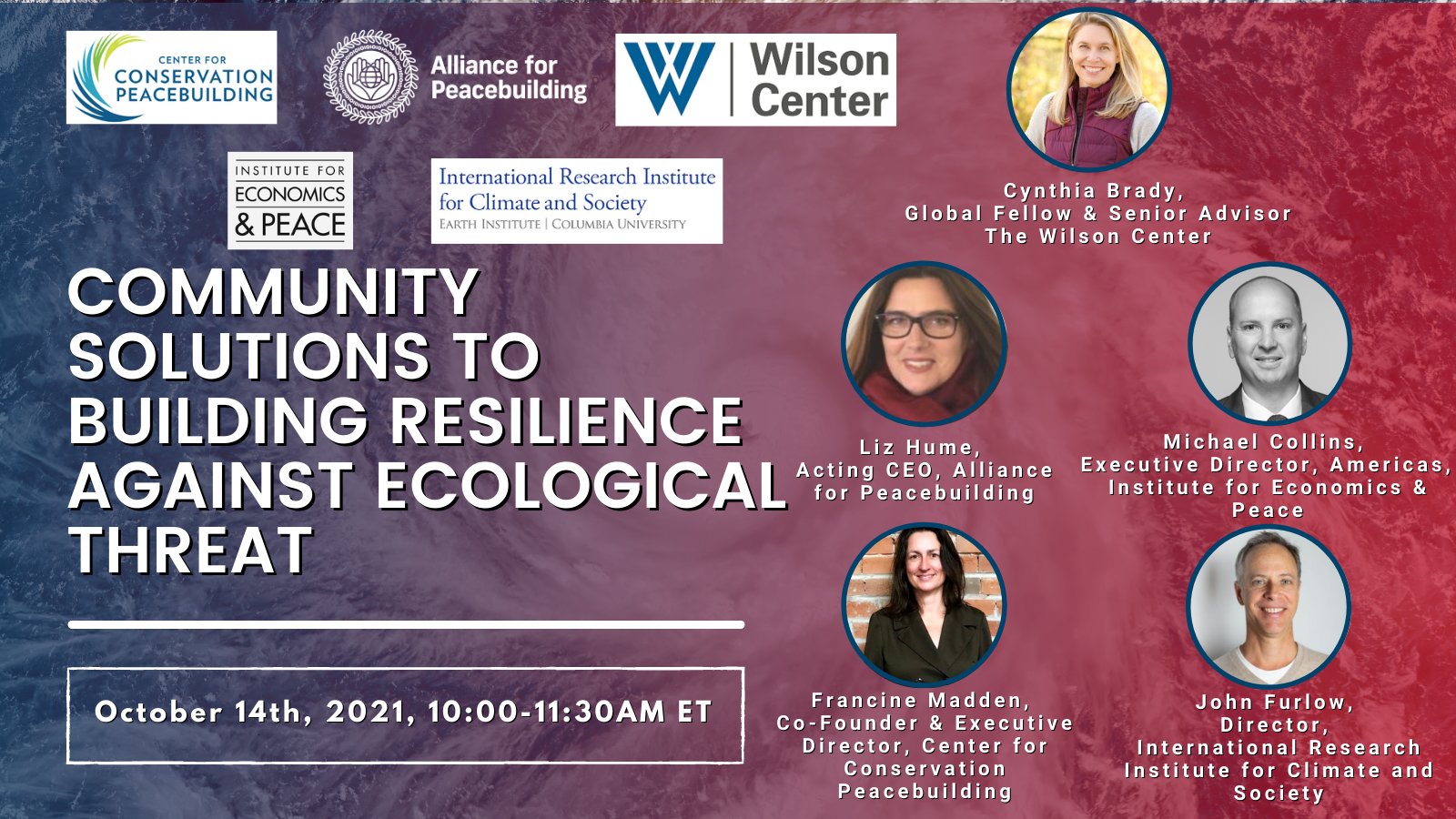 On Thursday, October 14th at 10:00am ET, join AfP and leading voices from the fields of conservation, climate change response and adaptation, conflict prevention, and climate-fragility for a discussion on how communities can best build resilience against ecological threats. Examining the newly released second edition of the Institute for Economics and Peace's Ecological Threat Register, the conversation will discuss how we can bridge the gap between the traditionally siloed disciplines of conflict prevention and environmental programming and how to merge global-level evidence with local action at the community level.