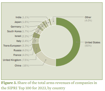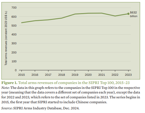 In 2023, the combined arms revenues of the world’s 100 largest arms-producing and military services companies reached $632 billion, a 4.2% increase from the previous year. While substantial, this figure is modest compared to the revenues of leading civilian companies. For instance, Walmart, the world’s largest company by revenue, reported $611 billion in 2023 .