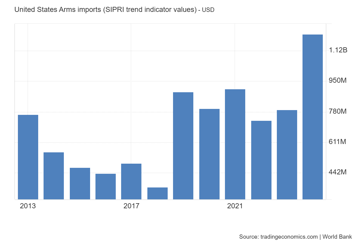 Despite being the largest arms exporter globally, the U.S. maintains a relatively low arms import ratio. In 2024, the U.S. imported approximately $1.21 billion worth of arms, accounting for less than 1% of its national demand for military equipment. This figure underscores the nation’s self-reliance in defense procurement, with most of its military needs met through domestic production.