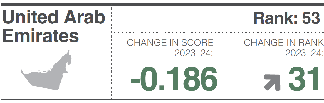 The United Arab Emirates (UAE) recorded the second largest improvement in peacefulness in the 2024 GPI. Its overall score improved by six per cent, leading to a 31-place rise in its ranking to 53rd position. Notably, the UAE demonstrated improvements in all three GPI domains of Ongoing Conflict, Safety and Security, and Militarisation. The UAE was the 4th most peaceful state in the MENA region, improving from its 5th place regional rank in the 2023 GPI.