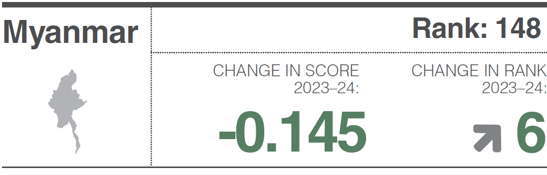 Myanmar experienced the fifth largest improvement in peacefulness in the 2024 GPI and the largest improvement in the Asia pacific region, with a 14.5 per cent improvement in overall score. Despite this progress, the country remains as one of the least peaceful countries in the world, due to its ongoing internal conflict. Myanmar placed 148th in the 2024 GPI, and ranked 18th in the Asia-Pacific region, just ahead of last-placed North Korea.
