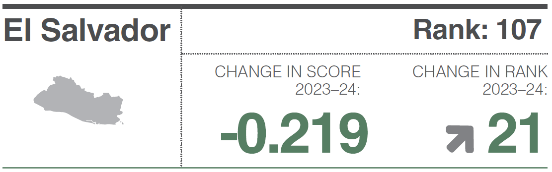El Salvador experienced the largest improvement in peace in the 2024 GP, with its overall GPI score increasing by 8.87 per cent, reaching its highest ranking since 2008 at 107th place. This marks the country’s first improvement in peacefulness in four years. This momentum shift is largely driven by a nation-wide crackdown on organised crime instigated by President Nayib Bukele, dramatically improving measures of peacefulness in the Central American state.