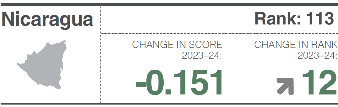 In the 2024 GPI, Nicaragua recorded the third largest improvement in peacefulness, climbing 12 places to 113th. Nicaragua’s overall GPI score improved by six per cent, led by substantial improvements in the Safety and Security domain which improved by 9.7 per cent. Within this domain, the political instability, violent crime, and violent demonstrations indicators saw the greatest positive change. Nicaragua’s improvements on these indicators in 2023 has been a function of the Ortega government’s tight control over civil society, law enforcement, and the judiciary. This control has reduced civil unrest, and in turn caused improvements in the frequency of violent crime and violent demonstrations.