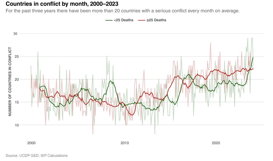 The increasing number of active conflicts may be limiting the ability of great powers to effectively intervene in conflict. It shows the one year moving average for conflicts with more and less than 25 deaths per month for the period 2000 to 2023. There are now an average of 25 active major conflicts a month, and a further 20 or so minor conflicts, compared to a decade ago when the average was less than 15 major active conflicts a month, and 17 minor conflicts.