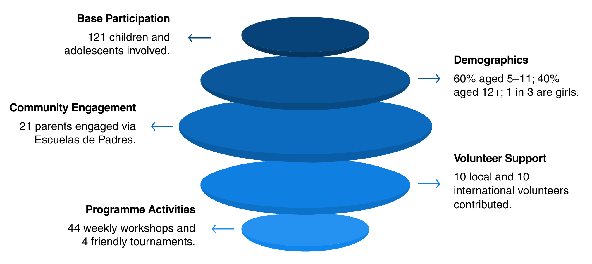Over the course of the year, 121 children and adolescents participated in the programme, with 60 per cent aged between five and eleven, and 40 per cent aged twelve and above. One in three participants were girls. The project delivered 44 weekly workshops on positive peace and sustainable development, hosted and participated in four friendly tournaments, and engaged 21 parents and caregivers through Escuelas de Padres sessions. Ten local volunteers completed practice in sports education, psychology, and international cooperation, while ten international volunteers contributed to the project.