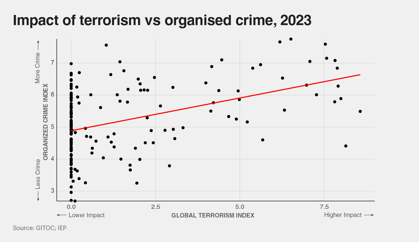 Ongoing action and changes reflect the complexities of the relationship between organised crime and terrorism, as can be read further in the Global Terrorism Index 2024 report.
