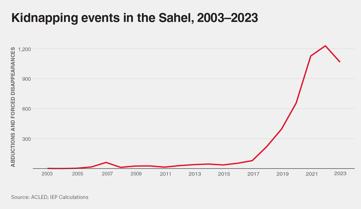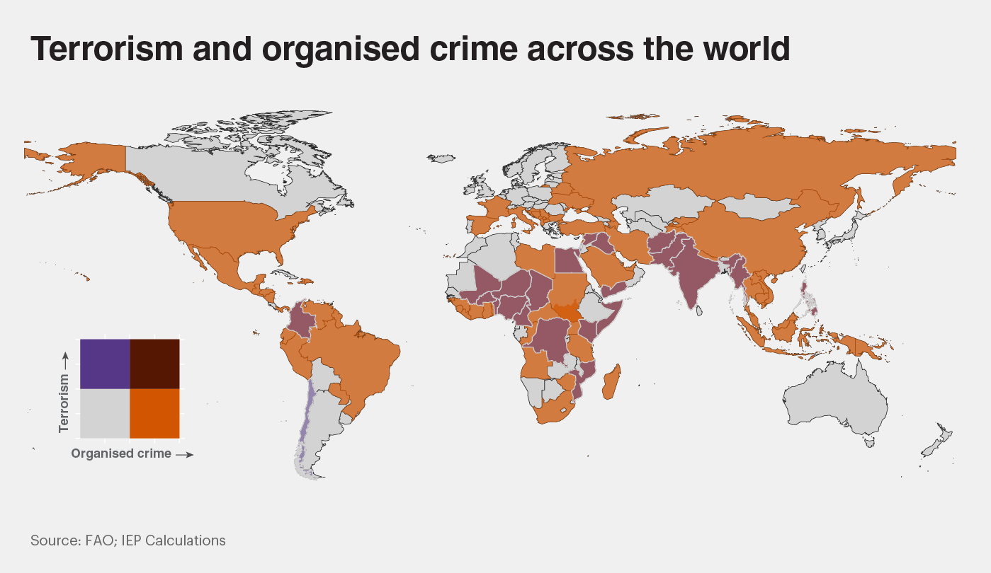 Many of these groups co-opt illicit economies which tax unregulated legal enterprises and ensure security and protection for the transporting of prohibited and counterfeit goods, arms and drugs. It extends into kidnappings and ransoms alongside other illegal activities such as livestock rustling and artisanal gold mining. While regions may experience high levels of organised crime, they may not experience a higher impact of terrorism; however, in countries with a high terrorism impact, there is almost always a coinciding large organised crime presence.