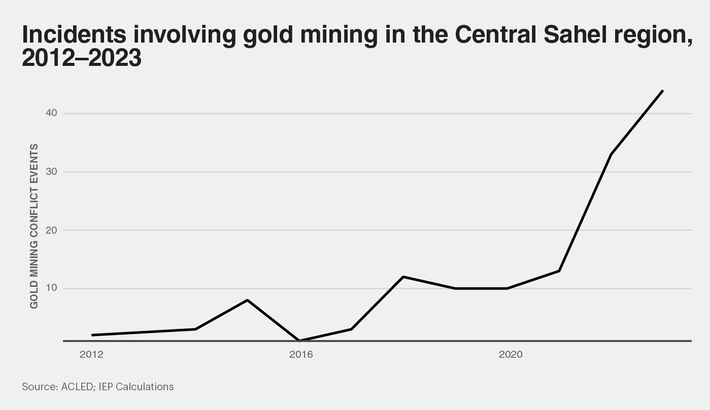 The region is affiliated to be the ‘hotbed of terrorism and violent extremism (TVE) in Africa’. Many of these states have little government control of areas, with Burkina Faso’ government estimated to only control around 60% of territory. Therefore, terrorist groups can compete and succeed in gaining influence and power in those areas where the state carries little control. This competition coincides with attempted territorial expansion. For example, in Burkina Faso and Mali, key terrorist group JNIM coins into the fruitful gold mining industry as a way to extend influence into these regions.
