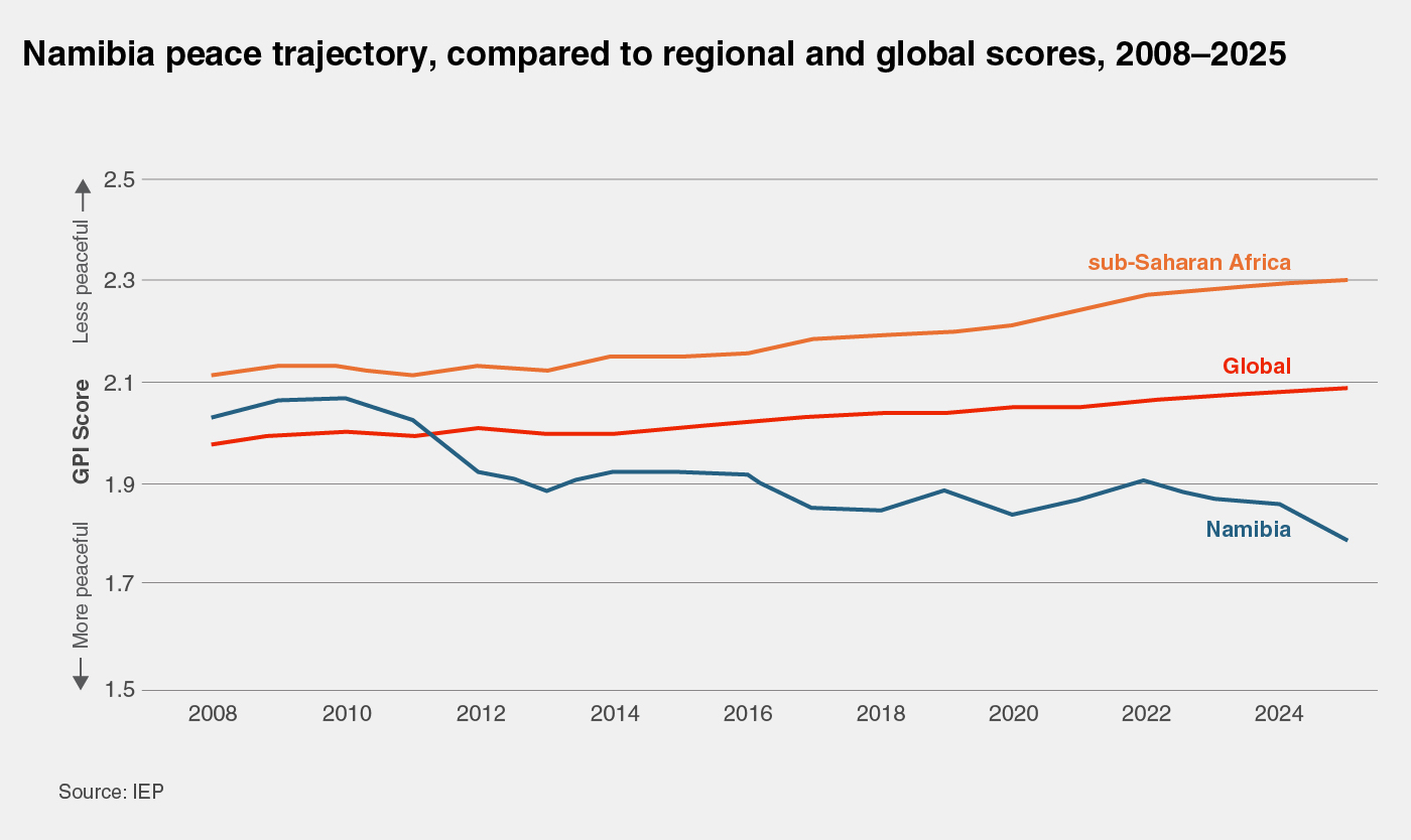 Perhaps no country better illustrates this dynamic than Namibia, which was the site of a successful peacekeeping operation at the time of the country’s independence from South Africa (1989-1990). Built on this foundation, Namibia has become the third most peaceful country in Africa. Over the past two decades, even as the region and the world have become markedly less peaceful, the country has seen its peace score improve by 13.4 per cent, the 11th largest improvement in peacefulness of any country in the index.