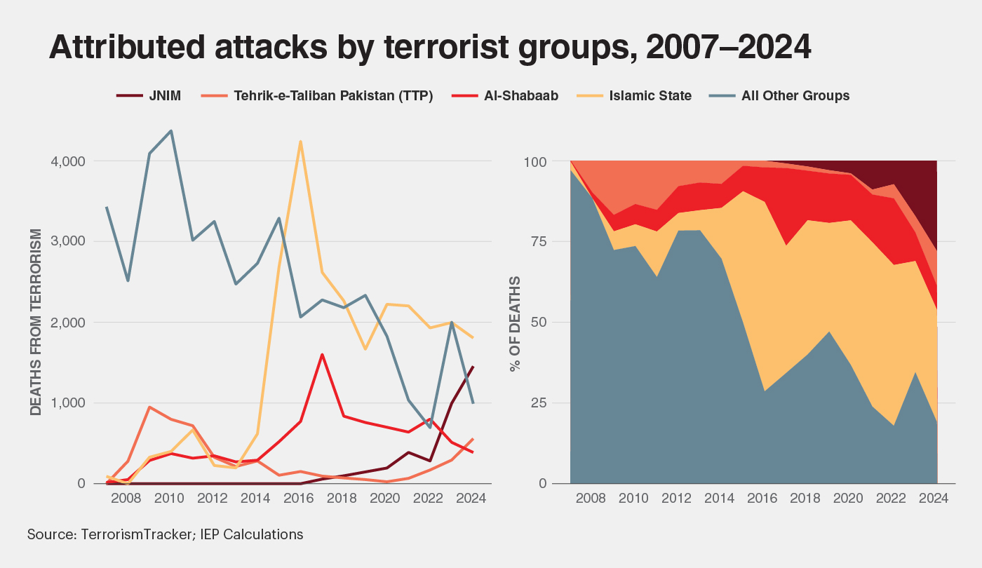 The four major terrorist organisations, IS, Jamaat Nusrat Al-Islam wal Muslimeen (JNIM), Tehrik-e-Taliban Pakistan (TTP), and al-Shabaab continued to increase their activity, with deaths attributed to these groups increasing by 11 per cent to 4,204. In 2023, these groups were active in 29 countries which increased to 30 countries in 2024.