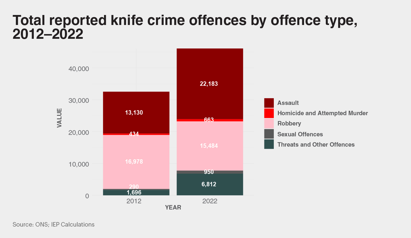 The surge in reported knife and sharp object-related violence is evident across the crime landscape in England and Wales. Assaults involving knives have risen by 69 per cent over the last decade, reaching over 22,000 reported offences in 2022. While robberies involving knives have fallen slightly during this period, they still make up a substantial portion of overall knife-related offences, with over 15,000 reported offences in 2022 alone. Additionally, reported sexual offenses involving a knife have more than tripled over the past decade.