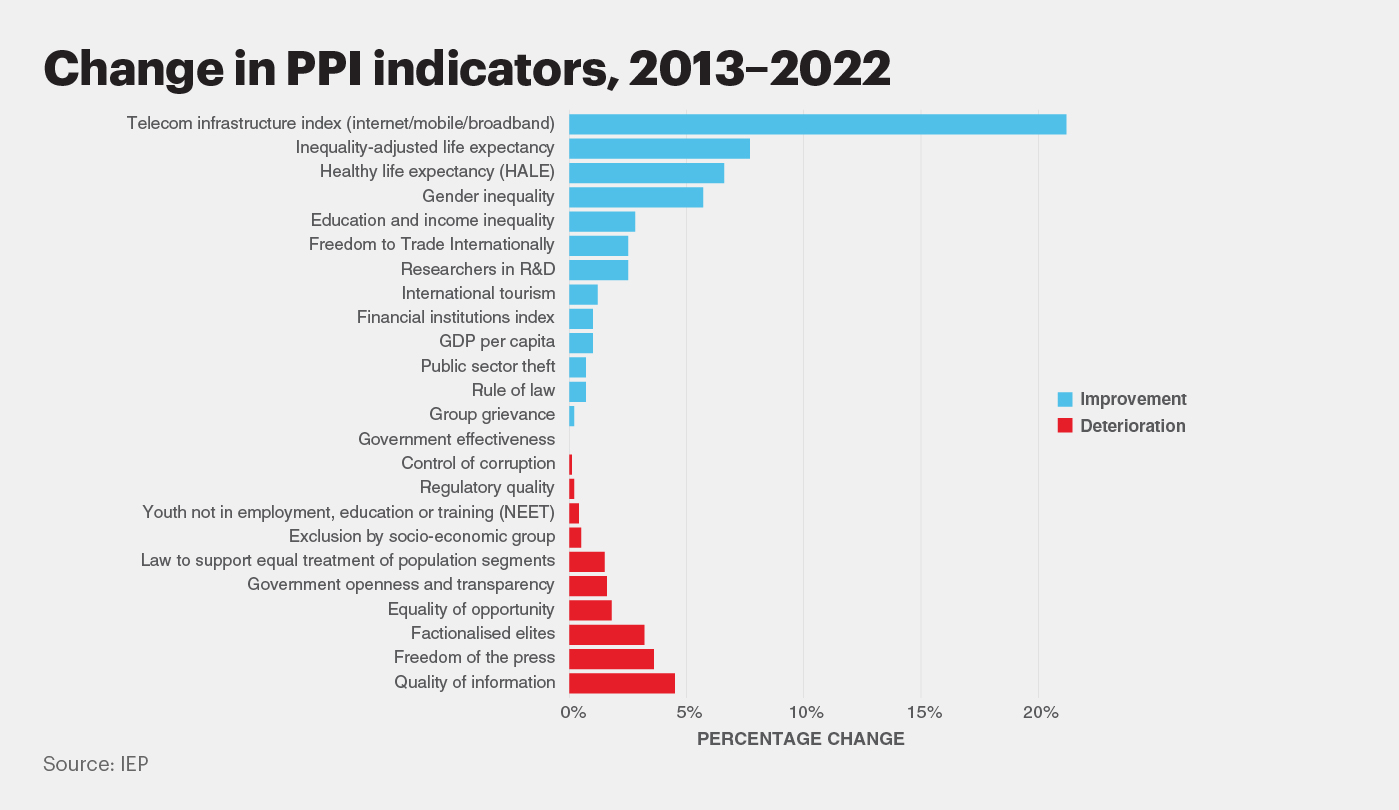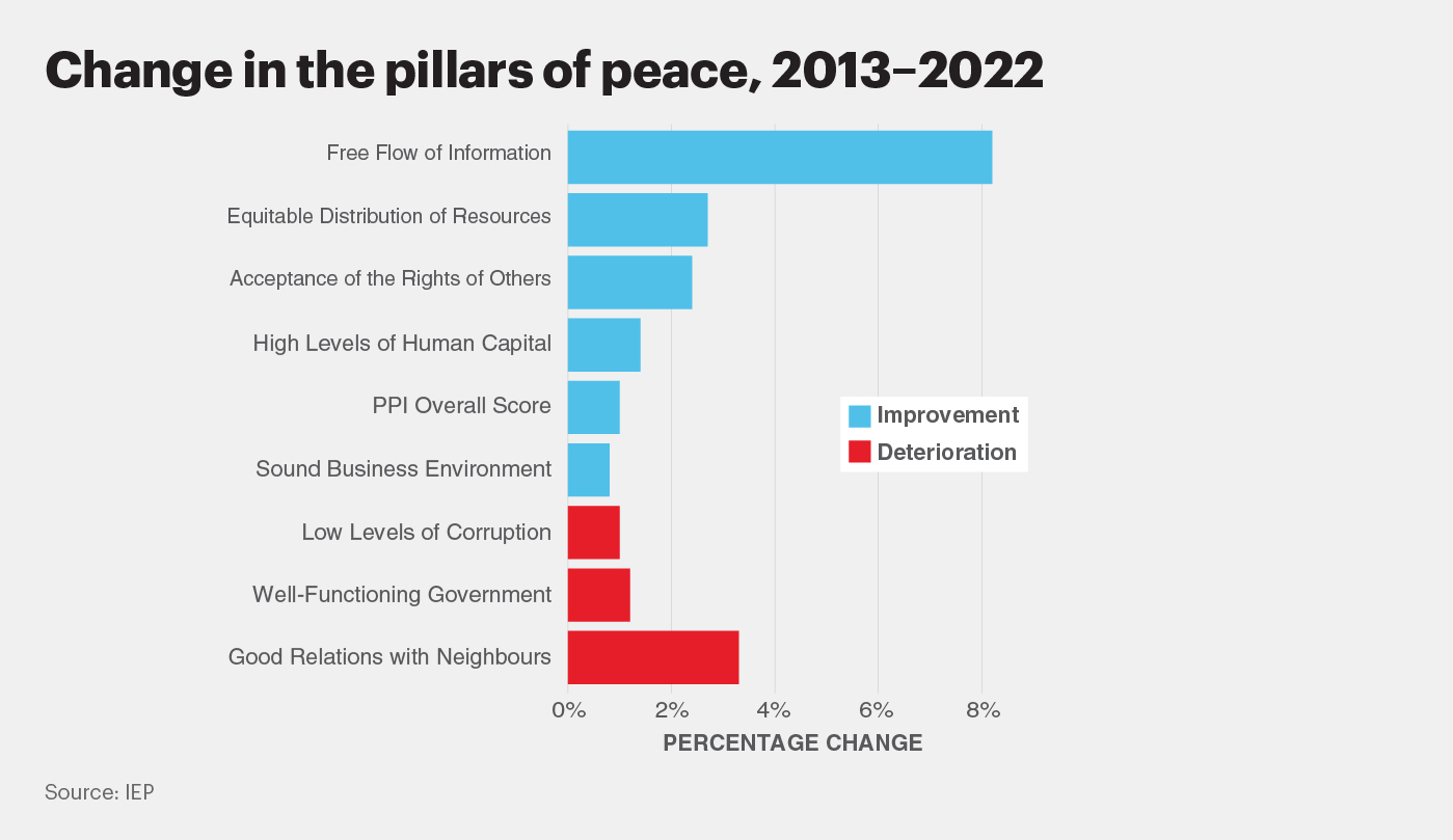 Positive strides have been made this year with regards to the Free Flow of Information, with it being recorded as the most improved Positive Peace pillar in the 2024 PPR, with a more than eight per cent increase because of increased global access to technology. This improvement matches trends over the past decade, with the Free Flow of Information rising drastically in comparison to other Pillars of Peace. Research from this year’s PPR developed by the Institute for Economics & Peace (IEP) finds that Free Flow of Information also increases countries’ income and economic growth. In fact, countries that improved in levels of Positive Peace recorded a boost in economic output of 59 per cent as opposed to a boost of only 27 per cent in countries whose levels deteriorated.