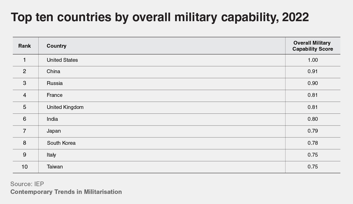 Now, in the Contemporary Trends in Militarisation Report, a first-of-its-kind military capability analysis by the Institute for Economics & Peace, a country by country comparison has been adjusted according to the technological differences between military assets. Against a backdrop of an increasing level of global militarisation, IEP’s report examines trends in militarisation expenditure, plus introduces the Military Technology & Capability (MTC) scoring system. The combination of these two provides a more accurate way to assess military power balances.