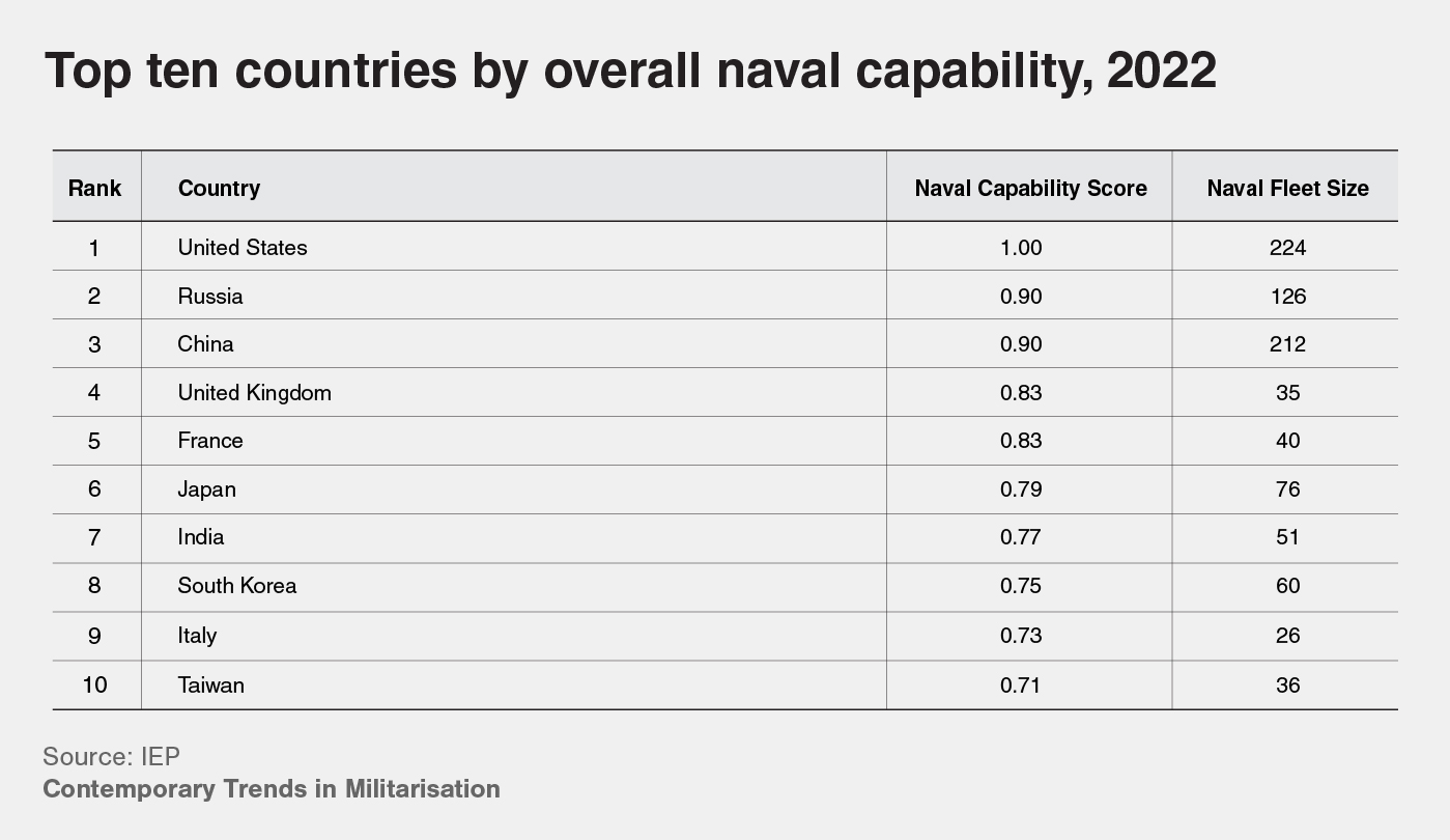The US also has a much higher level of naval capability than any other country, with Russia having the second highest level. Although the size of China’s fleet is almost as large as the US, the quality of its fleet means that it is in third place. The key factor explaining Russia’s higher naval capacity than China is its significantly larger fleet of ballistic missile nuclear submarines. China’s navy boasts a large fleet of frigates and corvettes, however these are awarded fewer points than other naval assets such as aircraft carriers, nuclear submarines, cruisers, amphibious assault ships, and destroyers.