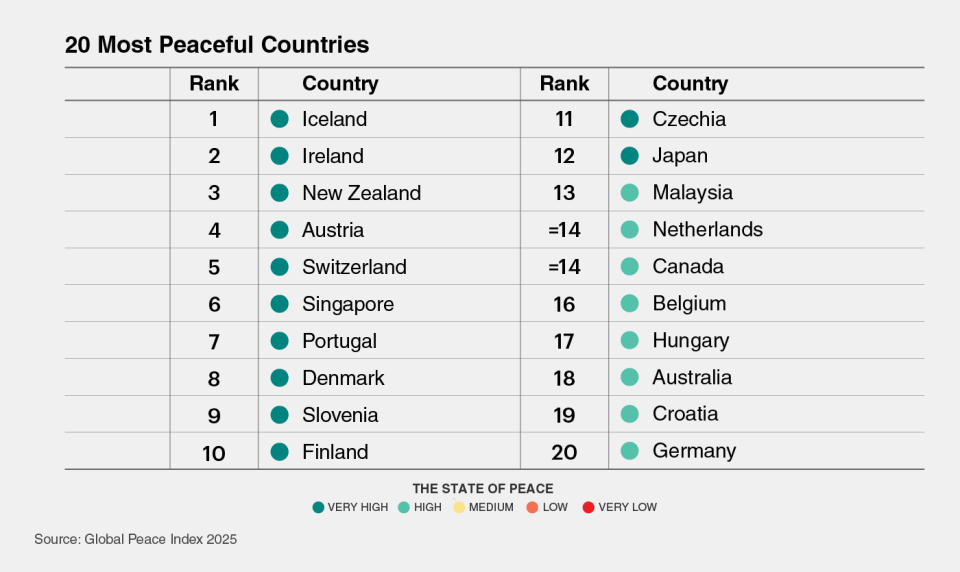 Even the most peaceful nations are not immune to the pressures of a more dangerous world, where peace is increasingly shaped not only by the absence of violence within states, but by how they navigate an international environment defined by uncertainty, competition and the risk of escalation.