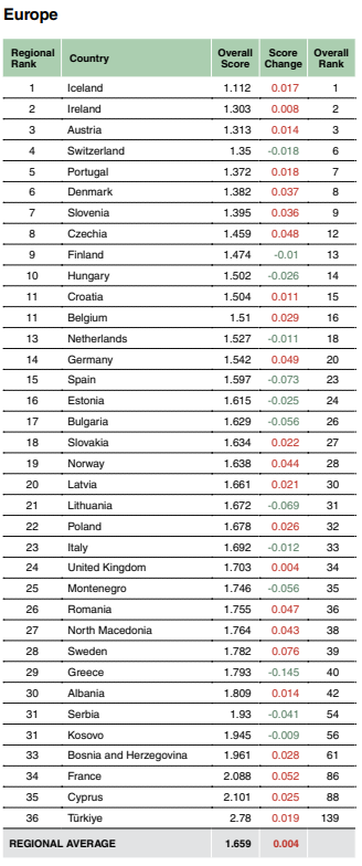 Iceland remains the most peaceful country in Europe and the world in the 2024 GPI. The gap in peacefulness between Iceland and Ireland, the first two countries in the 2024 GPI is the same size as the gap between the second and 15th ranked countries.
