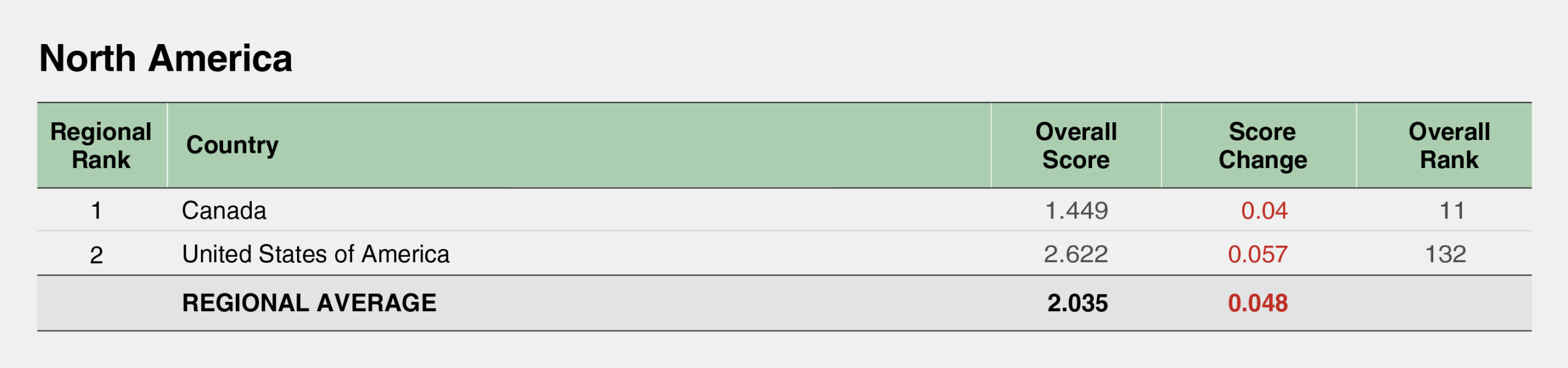 North America recorded the largest regional deterioration in the 2024 GPI, with the average level of peacefulness dropping by just under five per cent. However, despite this deterioration it remains the third most peaceful region globally, behind Europe and the Asia-Pacific. There is a considerable disparity in peacefulness between the two countries in the region, with Canada ranked as the 11th most peaceful country, while the US ranked as the 132nd most peaceful country globally. The largest regional deteriorations occurred in the Ongoing Conflict domain, with worsening perceptions of criminality, violent crime, and deaths from internal conflict.