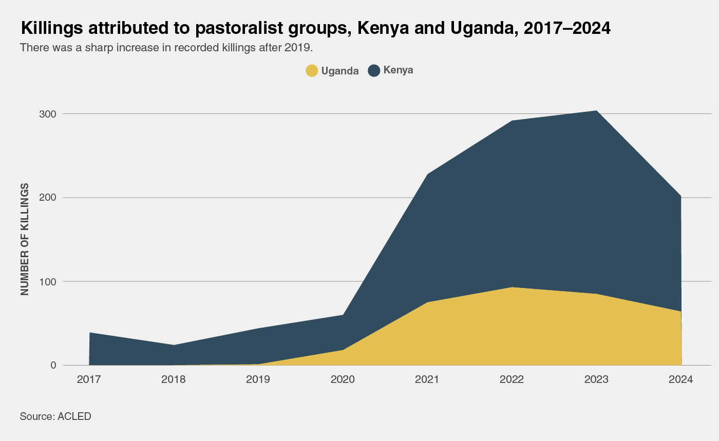 In Eastern Africa, the cost of a healthy diet rose by 44 per cent between 2017 and 2024, pushing an additional 57.8 million people into unaffordability. This left nearly 120 million people across the region in acute food insecurity and forced widespread reliance on relief grain. The resulting instability aggravated regional tensions and fuelled conflicts which killed hundreds of people across Uganda and Kenya in the following years, as seen in the following figure.