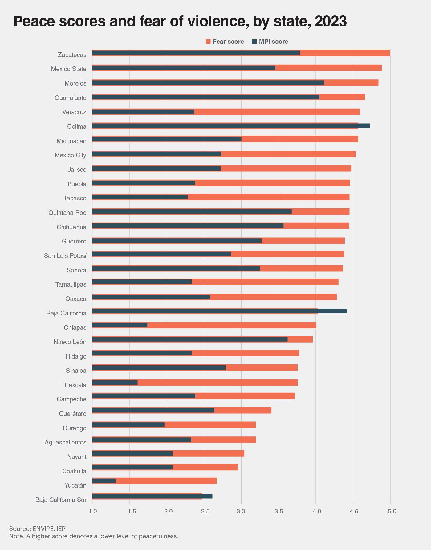 In this year’s edition of the Mexico Peace Index (MPI), we have included of a new indicator: fear of violence. Based on national survey data, the indicator refers to the degree to which citizens perceive the state in which they reside to be unsafe.
