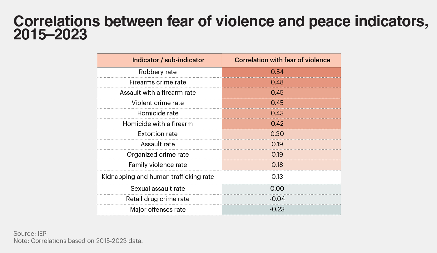 The relationship between overall levels of peacefulness and perceptions of safety is multifaceted, influenced by a variety of factors. According to the global survey data collected in the 2023 Safety Perceptions Index, crime and violence were the second most commonly cited risks since at least 2019, suggesting that violence, more than other risks, profoundly affects public perception of safety. An average of 35.8 per cent of respondents across 121 countries reported being “very worried” about violence crime, whereas only 5.6 per cent had reported experiencing it firsthand in the last two years. This significant gap – more than six times the number of people fearing violence than experiencing it – in perception is especially pronounced in Mexico, emphasising the importance of this indicator’s addition to the MPI.