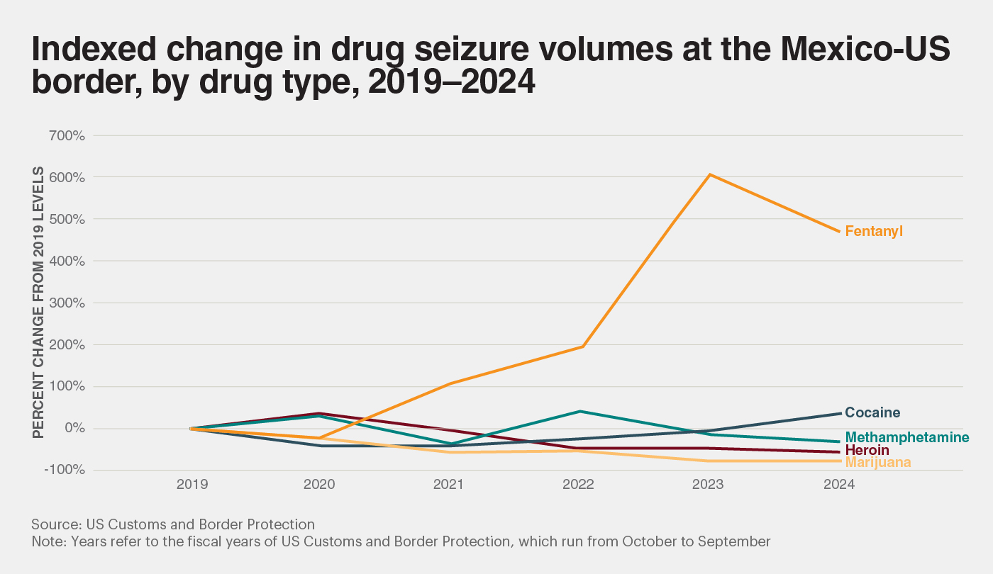 Despite the substantial increases in the consumption of fentanyl in the past decade, recent data suggests that the flow of fentanyl may have peaked in 2023. As seen in the figure above, following a 600 per cent increase between 2019 and 2023, the amount of fentanyl seized at the border decreased by 20 per cent in 2024. Additionally, last year was the first year on record to register a decline in overdoses involving the drug. Drug overdose deaths in the United States reached an all-time high of over 110,000 in 2023 but fell to around 87,000 last year. This drop was almost entirely the result of a substantial decline in deaths involving synthetic opioids, primarily fentanyl, which fell from around 81,000 deaths to around 59,000. Experts point out a variety of possible causes, including improved addiction healthcare, less potent fentanyl being sold, and that the high death rates in recent years have caused there to be a lower population of vulnerable people living with addiction.