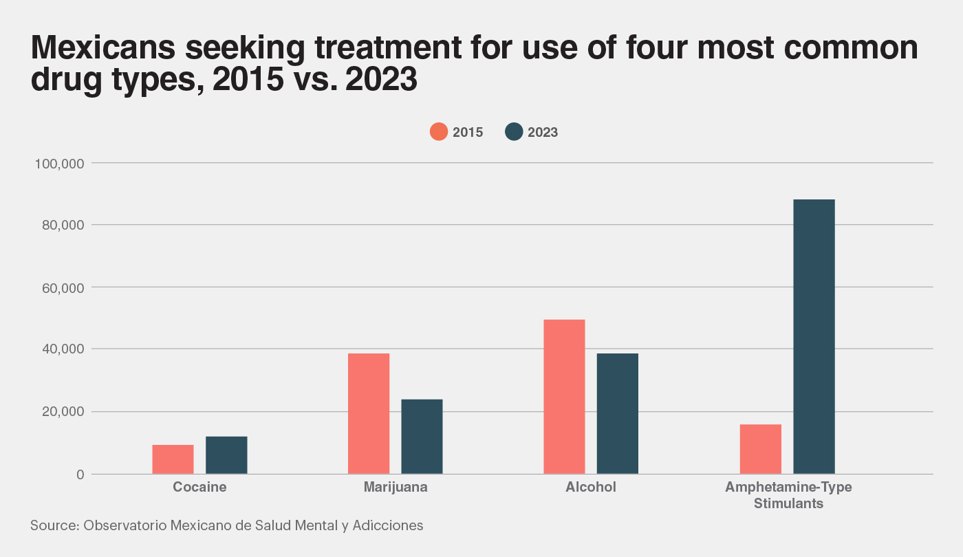 Data from the Mexican Observatory for Mental Health and Addictions reveals that substance abuse has risen in Mexico in the past decade. The number of people seeking treatment in the country for use of psychoactive substances rose from around 142,000 in 2015 to about 179,000 in 2023. As shown in the following figure, this increase has been driven by growing abuse of amphetamine-type stimulants, which include methamphetamine and ecstasy.