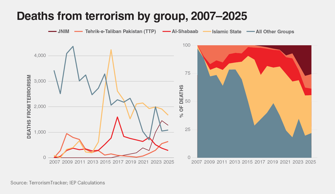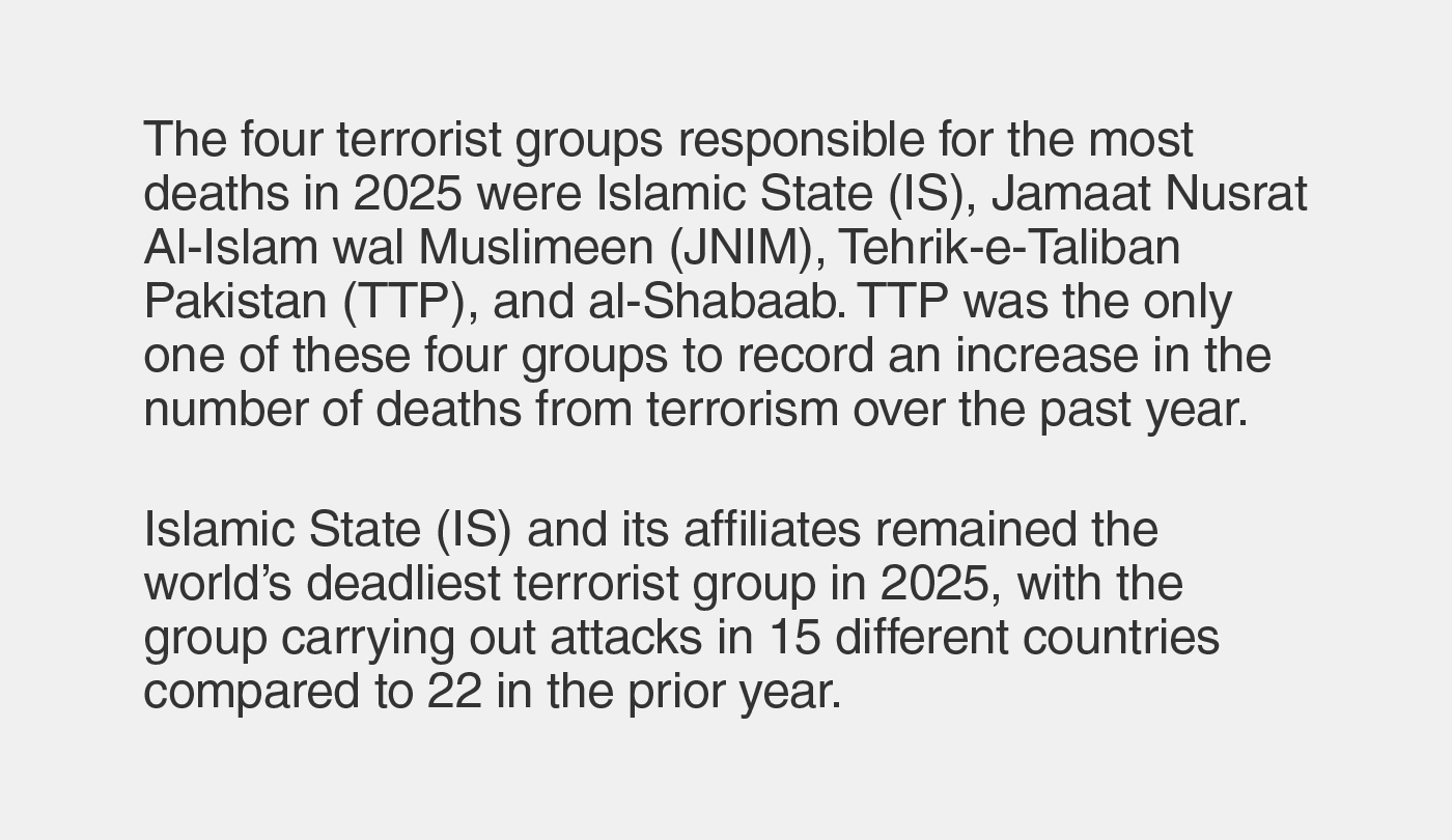 The four deadliest terrorist organisations, Islamic State, Jamaat Nusrat Al Islam wal Muslimeen, Tehrik e Taliban Pakistan, and al Shabaab, were responsible for a substantial share of deaths in 2025.