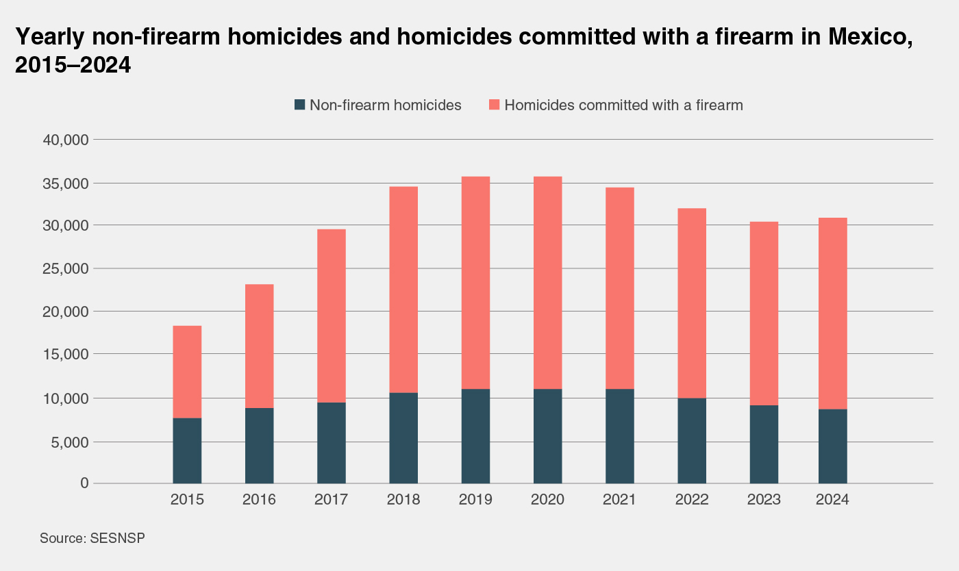 The flow of US guns into Mexico has been associated with a substantial deterioration in peacefulness in the country over the past decade. Since 2015, the Mexico Peace Index has recorded a 71.2 per cent increase in the firearms crime rate, as shown in the figure below. This increase has been primarily driven by a rise in homicides committed with a firearm, which now account for nearly 72 per cent of all homicides in Mexico. In the past ten years, it is estimated that over 200,000 people have been killed with guns in the country