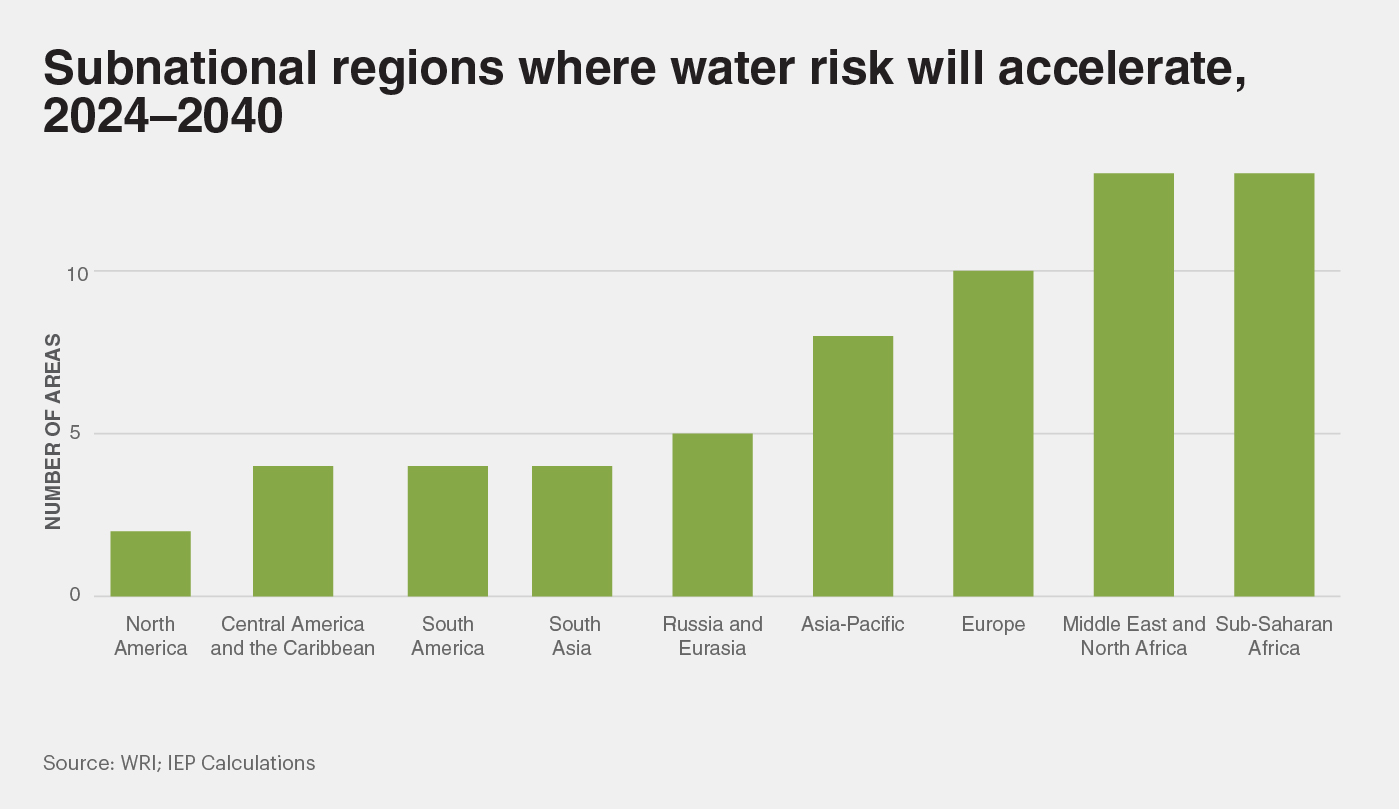 In the latest Ecological Threat Report, IEP research explores the correlation between conflict dynamics and historical ethnic borders, an issue that has been exacerbated by rising ecological threats, particularly water scarcity. Heightened water scarcity has led to greater competition for resources, increasing potential intergroup conflict. Strong governance and effective infrastructure development is greatly needed for the mitigation of water-related risks, allowing for the effective management of the available water supply. Effective water management is a key factor towards a reduced risk in conflict, promoting a sustainable development within regions prone to water scarcity and ethnic tensions.