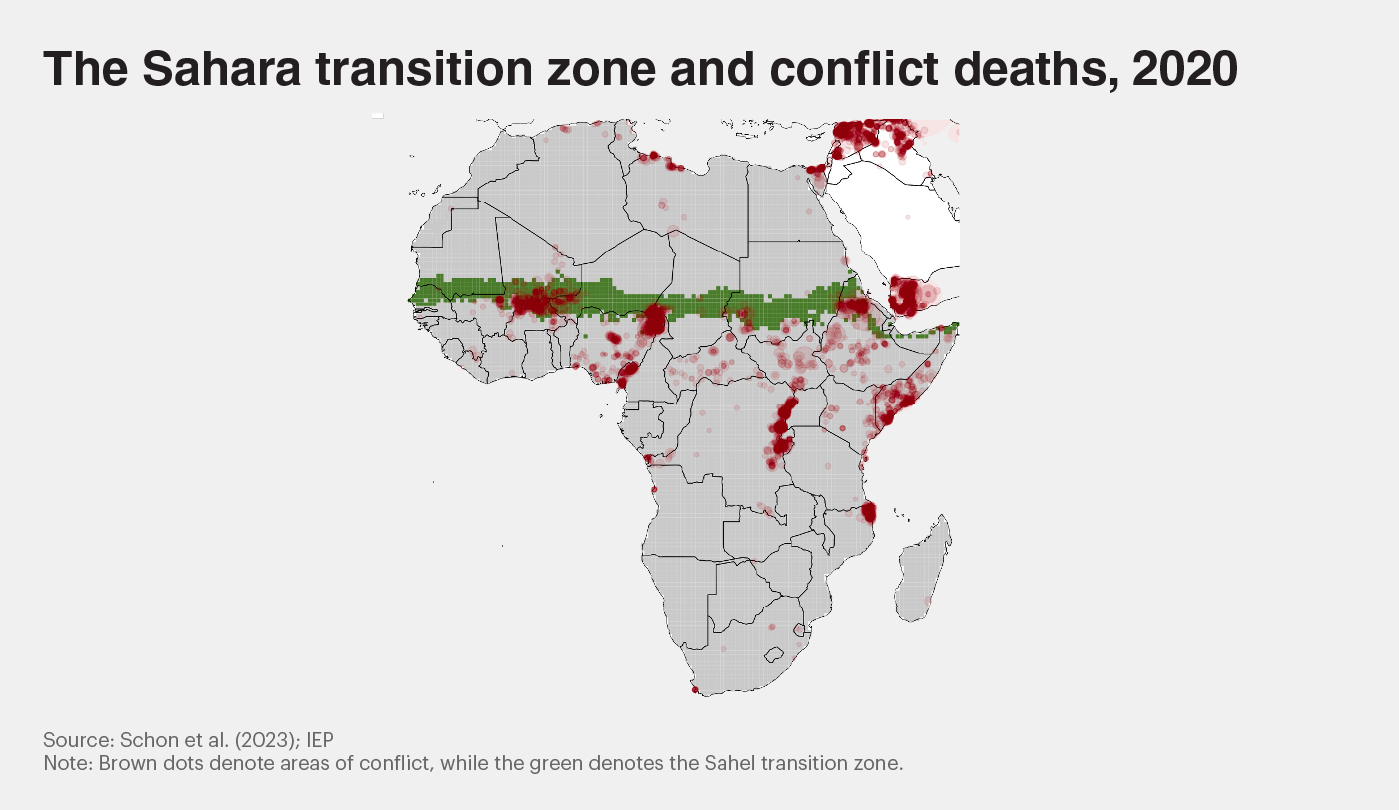 Without an effective government or institutions, there is a high risk of conflict, demonstrated through the heightened conflict between the ethnic groups in the Sahel region. Within arid and semi-arid regions, cooperation has been difficult between sedentary farming communities (live in permanent settlements) and nomadic pastoralist herders (move from place to place). This had led to an increase of violent disputes over common resources; farmers require water for crop cultivation whilst herders require water for livestock. Due to the intensified periods of drought and reduced rainfall, there has been heightened water stress for both groups. This results in severe consequences, due to 72% of the demographic’s livelihoods relying on agriculture according to the United Nations’ Food and Agriculture Organisation. In particular, the Sahel region is a transition zone, its increased susceptibility to climate change causing huge climate fluctuations. Consequently, the reduction of farming land and grazing areas, as seen in Figure 2.4, has exemplified conflict levels over resources.