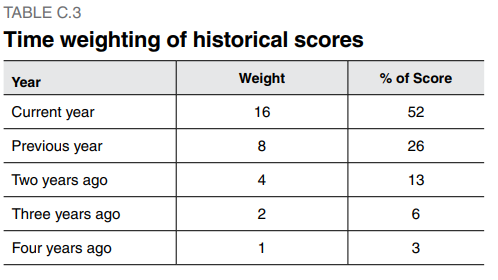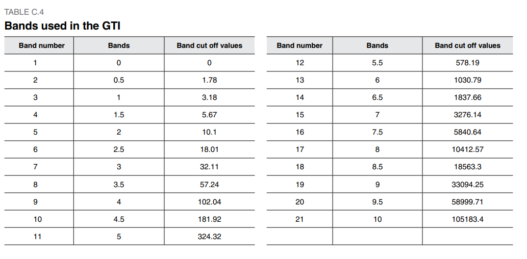 As shown in Table C.4,C.4 this mapping method yields a total number of 21 bands. This maps all values to a band of size 0.5 within the scale of 0-10. To band these scores, the following method is used: