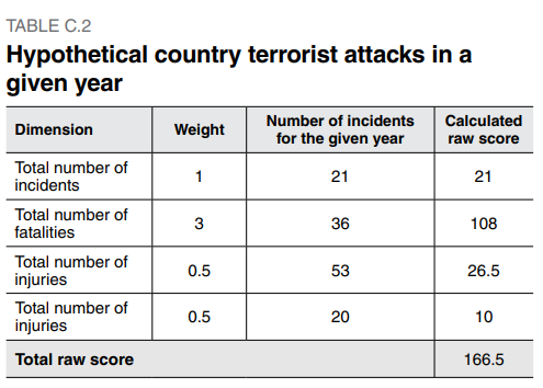 Given these indicator values, this hypothetical country for that year would be assessed as having an impact of terrorism of (1×21) + (3×36) + (0.5×53) + (0.5×20) = 166.5.