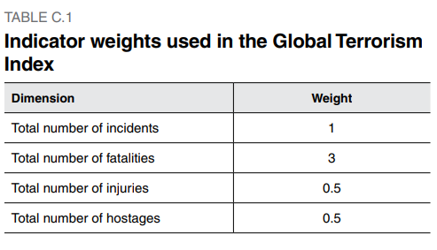 Each of the factors is weighted between zero and three, and a five-year weighted average is applied in a bid to reflect the latent psychological effect of terrorist acts over time. The weightings shown in Table C.1 were determined by consultation with the GPI Expert Panel.
