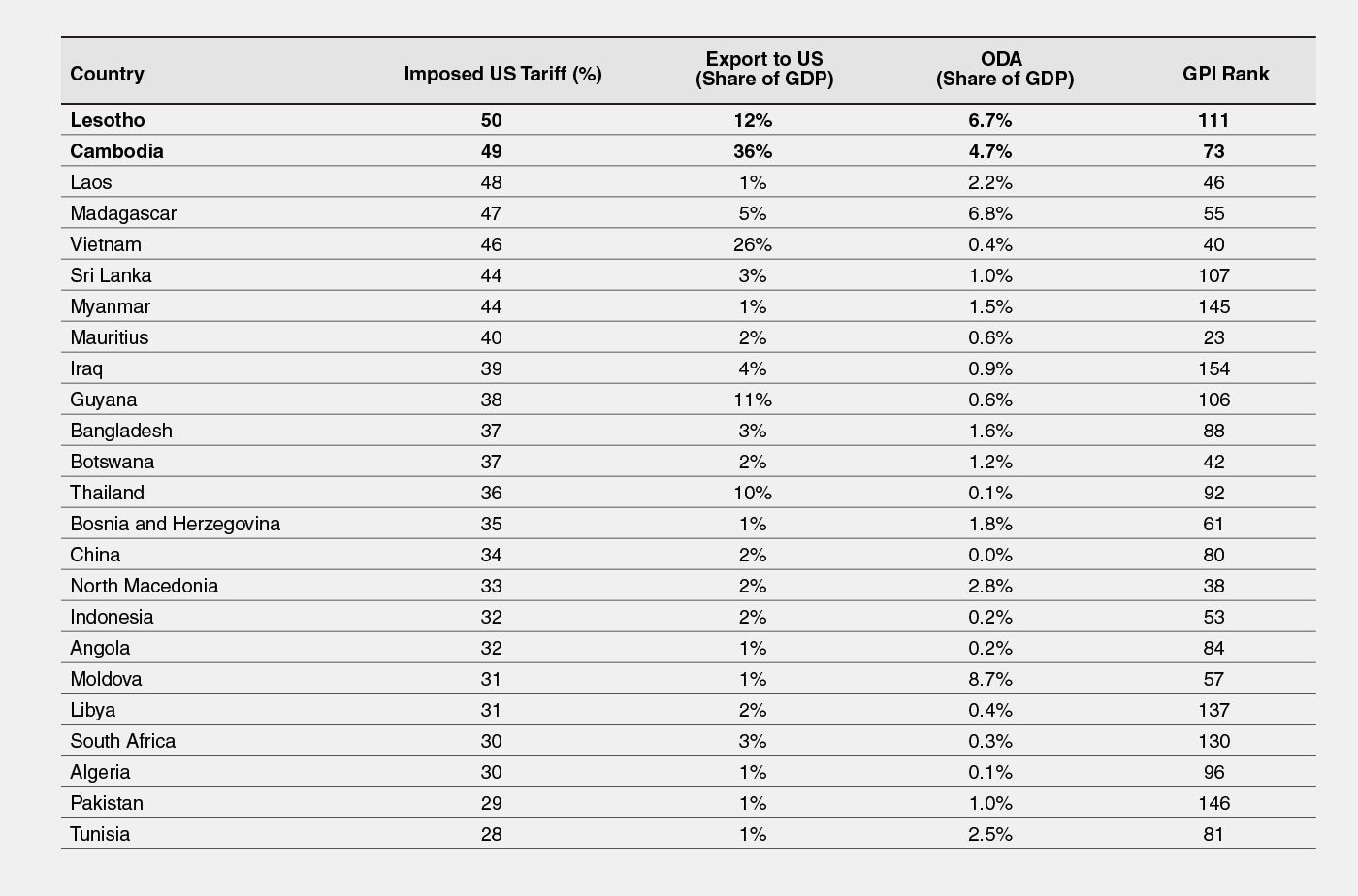 For countries like Cambodia, where exports to the US represent 36% of GDP, or Lesotho, facing steep 50% tariffs while simultaneously relying on international aid for nearly 7% of its economy, the threat these dual policy shifts represent are more than economic headwinds. This policy convergence disproportionately impacts precisely those nations least equipped to absorb such shocks, creating potential flashpoints for instability across multiple regions already challenged by fragility and conflict.