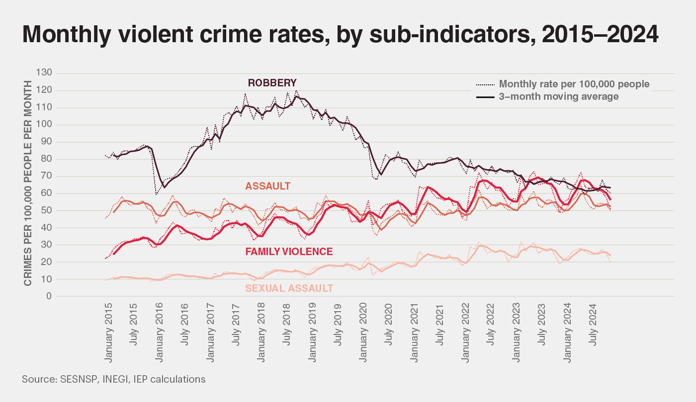 The two violent crime sub-indicators of the Mexico Peace Index most associated with violence against women are sexual assault and family violence. The official rates of these two sub-indicators have more than doubled in the past decade, as reflected in the following figure. Moreover, the state of Colima has experienced the worst deteriorations in both. Colima’s rate of sexual assault has increased tenfold since 2015, and its rate of family violence has increased fivefold.