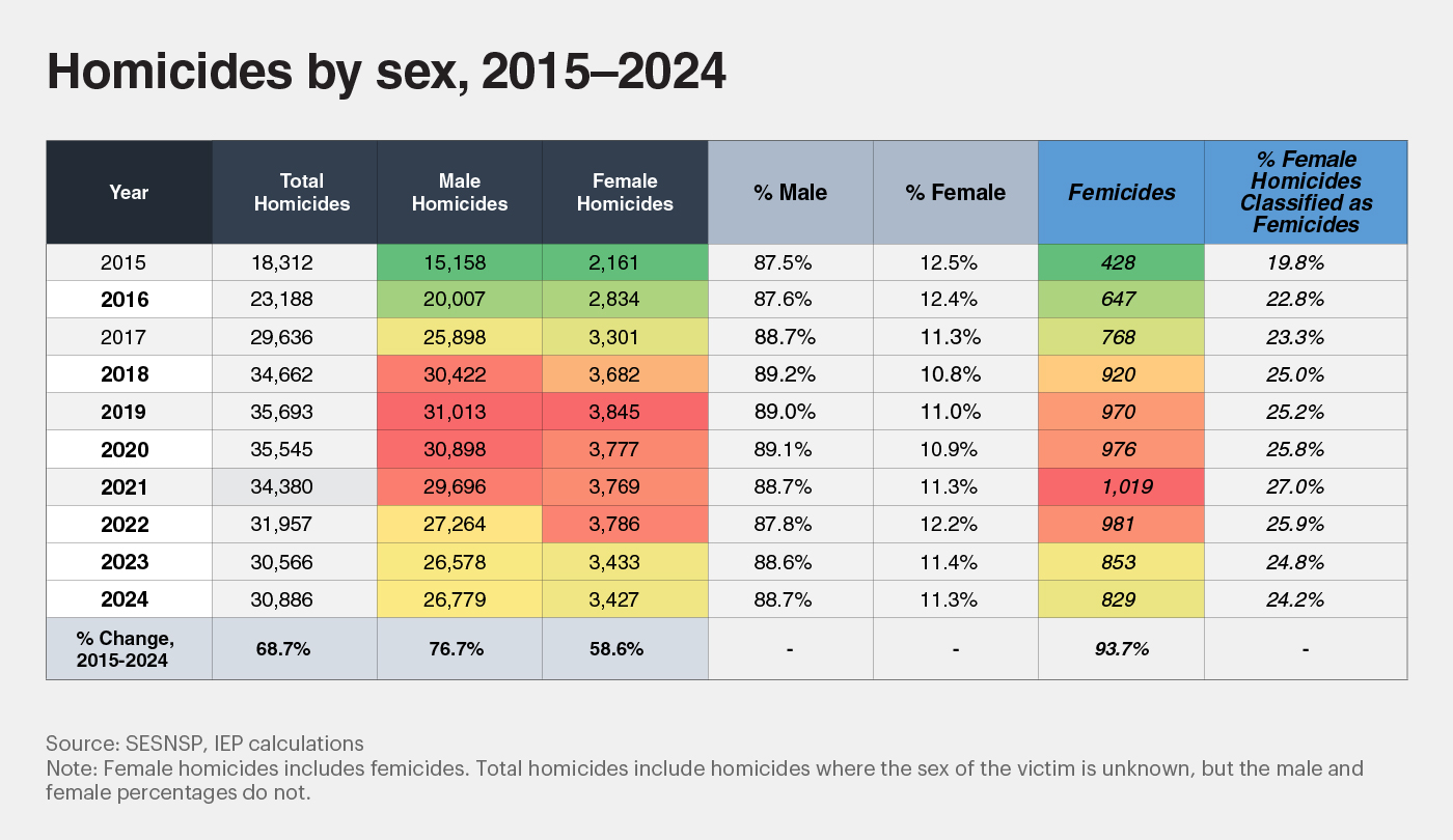 In this year’s Mexico Peace Index 2025 report, we examined violence against women in Mexico, highlighting how it is deeply rooted in machismo, impunity and socio-cultural norms that perpetuate discrimination against women. Impunity and ineffective institutional responses represent a critical challenge for preventing and punishing gender-based violence in Mexico.