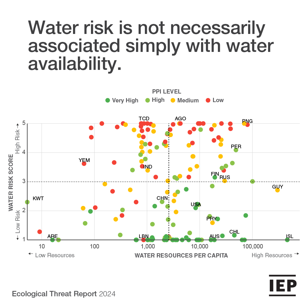 The 2024 Ecological Threat Report (ETR) is the fifth edition of a quantitative analysis of ecological threats in 207 independent states and territories. Among the four ecological threats examined in the ETR is water risk, which assesses the proportion of a population that does not have access to clean drinking water.